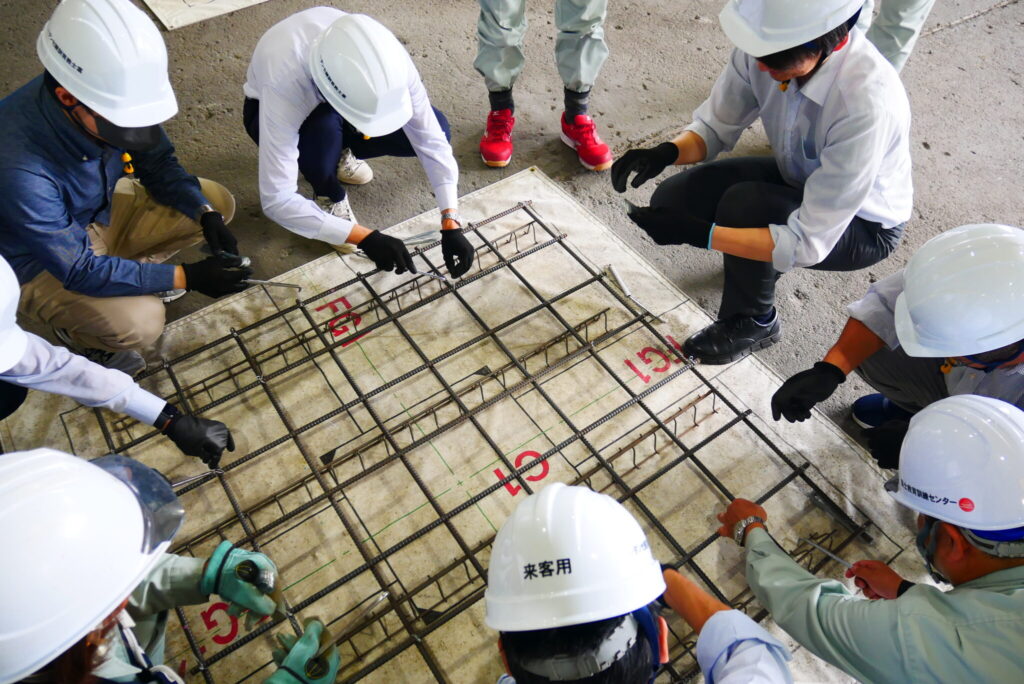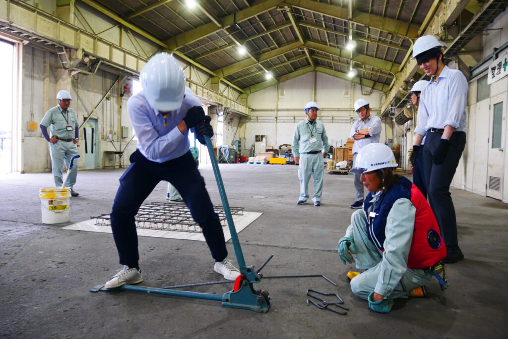 次に鉄筋結束を体験。同じく訓練センターの町美差恵講師が指導を担当。「良く見ていてください」と言いながら、わざと一瞬で結束するなど、ユーモアを交えた説明が体験を楽しくさせていました。また、ベンダーでの鉄筋切断も行い、10ミリと13ミリの鉄筋、直線部と曲線部の切断時にかかる力の違いを体感しました。