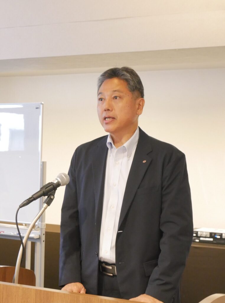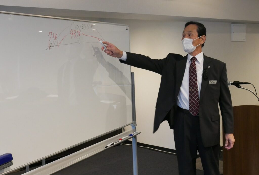 午前の講義の「人間力の向上」では、「常に頭に入れて置き、やってもらいたい」こととして、①聞き上手の訓練、②自分を見つめ直して、さらにスキルアップする訓練、③メモをとる訓練、④仲間との親睦を深め、良い所を学び取る訓練、⑤限られた時間を効率良く使う訓練―の「5つの『ながら訓練』」を挙げました。また。スピーチの基本的な心得として、「良い心で、良い事を考え、良い表情で話す」など5項目を紹介し、特に表情や身振りなどの非言語情報の重要性を指摘しました。