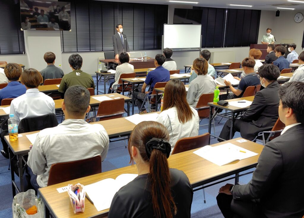 研修は「人間力の向上~社会人としてのより良い自分づくり~」「コミュニケーション能力の向上と実践~交流から自己啓発~」が大きなテーマ。花輪講師は「コミュニケーション能力を高め、交流を深めてほしい。一人一人が積極的にものを考え、行動してほしい」と呼び掛けて研修がスタート。