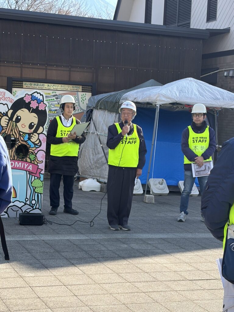 道の駅「朝霧高原」の事業主体である国土交通省、富士宮市と、運営責任者の㈱富士山は12月11日、富士宮市根原の同所で防災避難訓練を行いました。富士教育訓練センターからは、米良力校長、高村隆総務部長ら職員5人が参加しました。